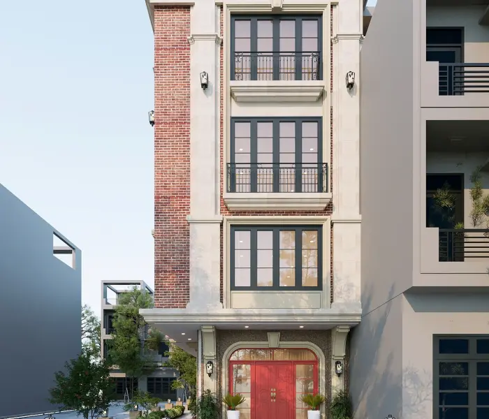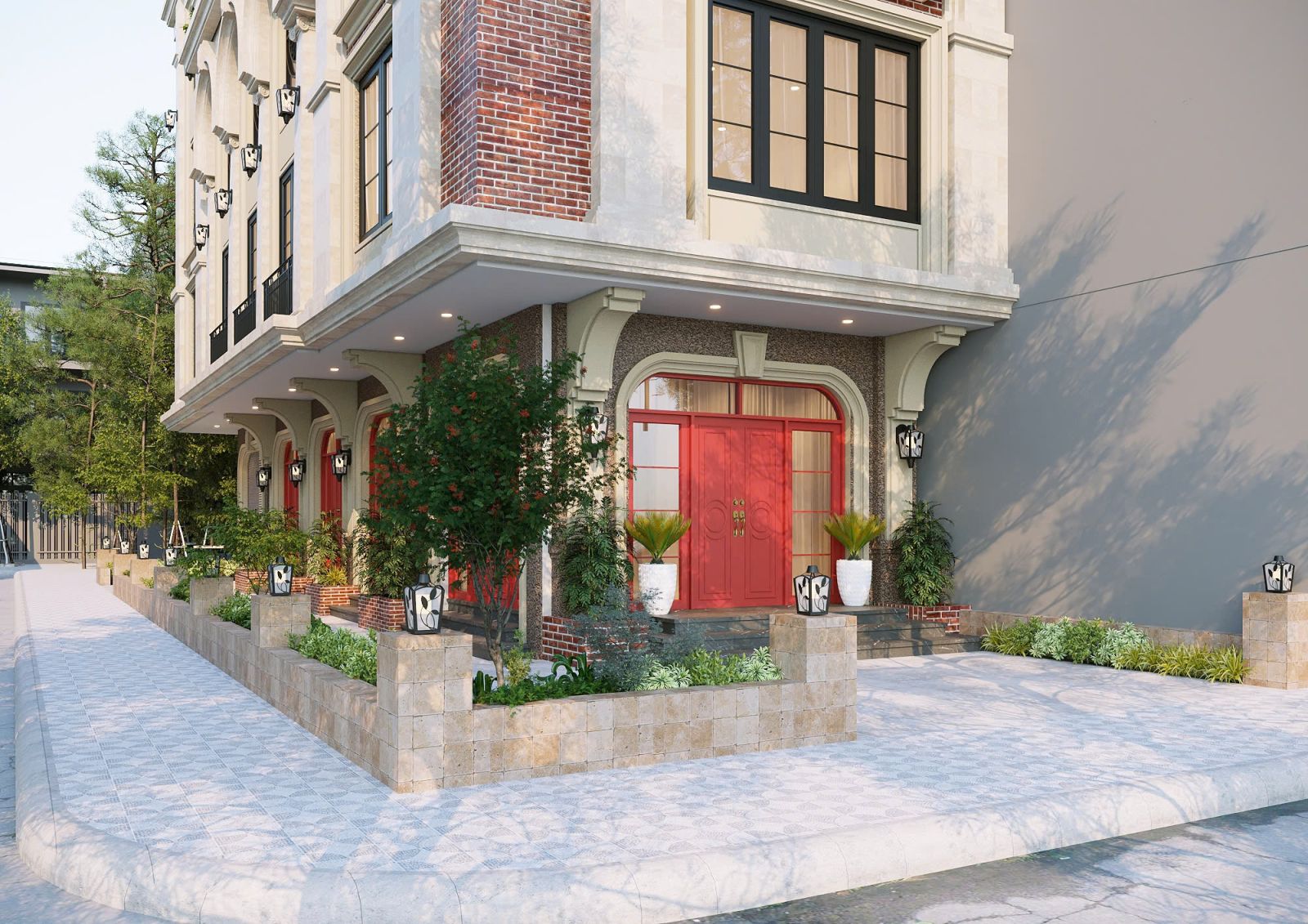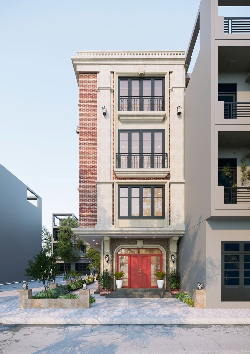 ⭐️Tinh thần Neo Classic được diễn đạt qua bảng màu nền be sáng phối đỏ gạch và ghi nhạt, tạo nền thẩm mỹ ấm và sang. Gạch thẻ đỏ mang chất cảm vật liệu rõ nét, đi cùng phào chỉ đá tinh giản để tạo chiều sâu mà không nặng nề. Kính khổ lớn bảo chứng cho độ mở và sự giao tiếp với cảnh quan, còn lan can sắt mỹ thuật đưa nhịp điệu duyên dáng lên cao. Sự tiết chế trong trang trí – thay bằng độ tinh sạch của vật liệu – giúp công trình giữ được vẻ đẹp lâu bền và ít bị lỗi thời.