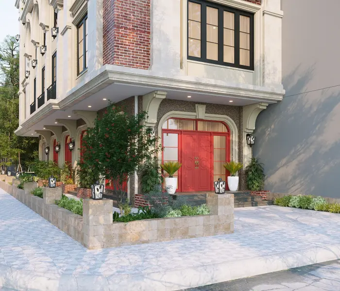 ⭐️Tầng trệt được quy hoạch cho hoạt động thương mại – kinh doanh, tạo một “tầng đế” vững chắc cho toàn bộ khối nhà. Điểm nhấn là hệ cửa lớn màu đỏ đô: sắc đỏ trầm, sang và có chiều sâu, làm rõ thông điệp đón chào và gợi cảm giác tin cậy ngay từ cái nhìn đầu tiên. Cặp vòm mềm mại giúp ô cửa vừa cao vừa thoáng, mở rộng tầm nhìn cho khách, đồng thời tăng độ nhận diện trên trục phố. Tỷ lệ mảng đặc – rỗng được cân bằng để vừa đủ kín đáo khi vận hành, vừa đảm bảo trải nghiệm trưng bày hấp dẫn.